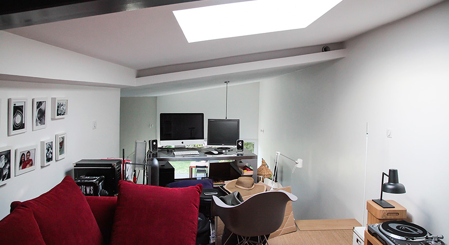 Il profite de toute la hauteur du volume tout en étant très confortable thermiquement. Des panneaux rayonnants cachés dans l’ensemble du faux-plafond diffusent une chaleur répartie qui rayonne sur le sol de teinte sombre en résine type béton ciré. Un complément de panneau chauffant est installé au sol au pied de la grande baie vitrée. Une VMC double flux permet un apport d’air neuf filtré et préchauffé. Des matériaux doux et des teintes sobres sont employés. Escalier en chêne massif, résine grise au sol, plan de travail en Corian®, terrasse en lames de bois reconstitué…